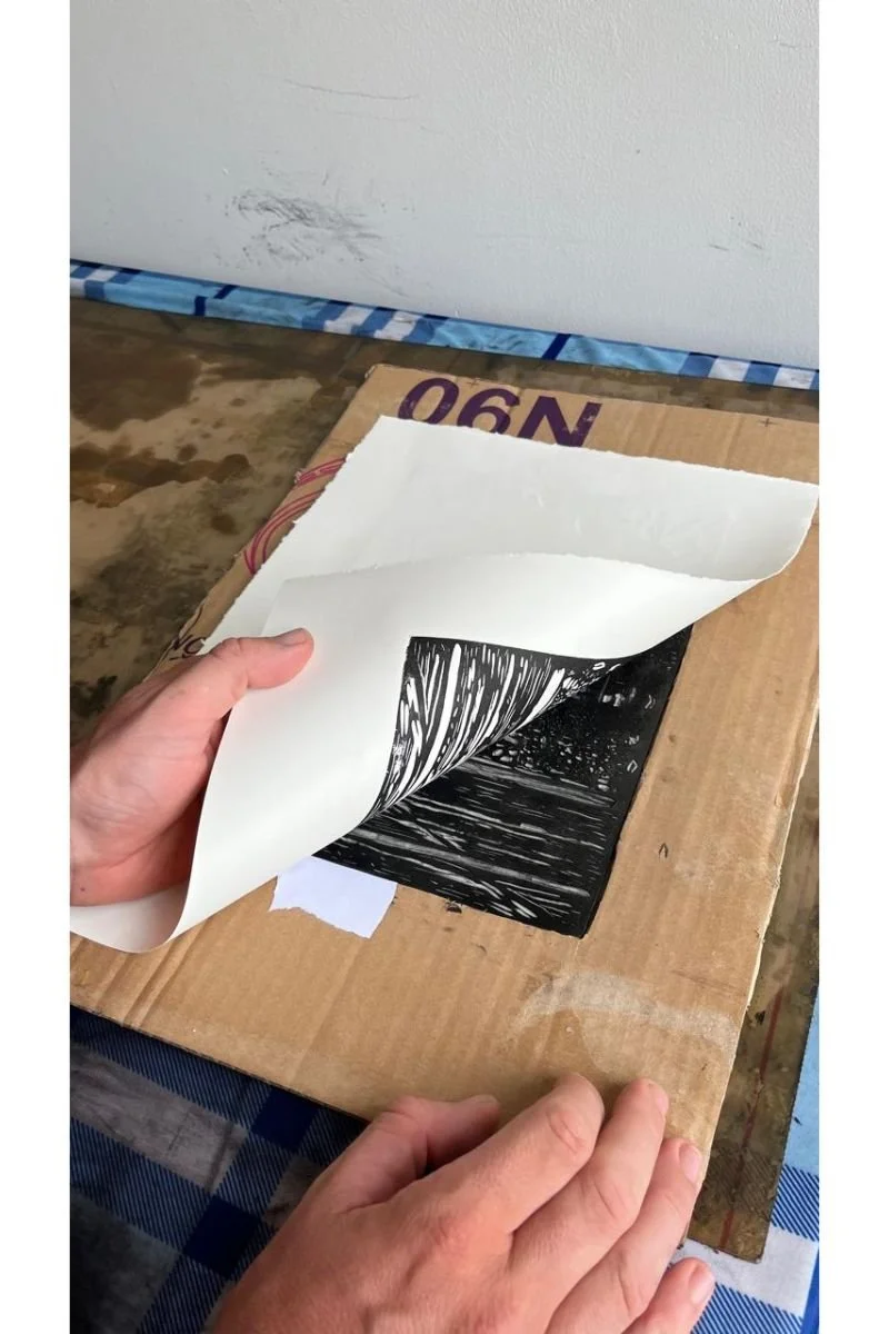 Slowly peeling back a linocut print, note the cardboard frame to protect the paper from ink and the small piece of ripped paper just to cover any random ink smears
