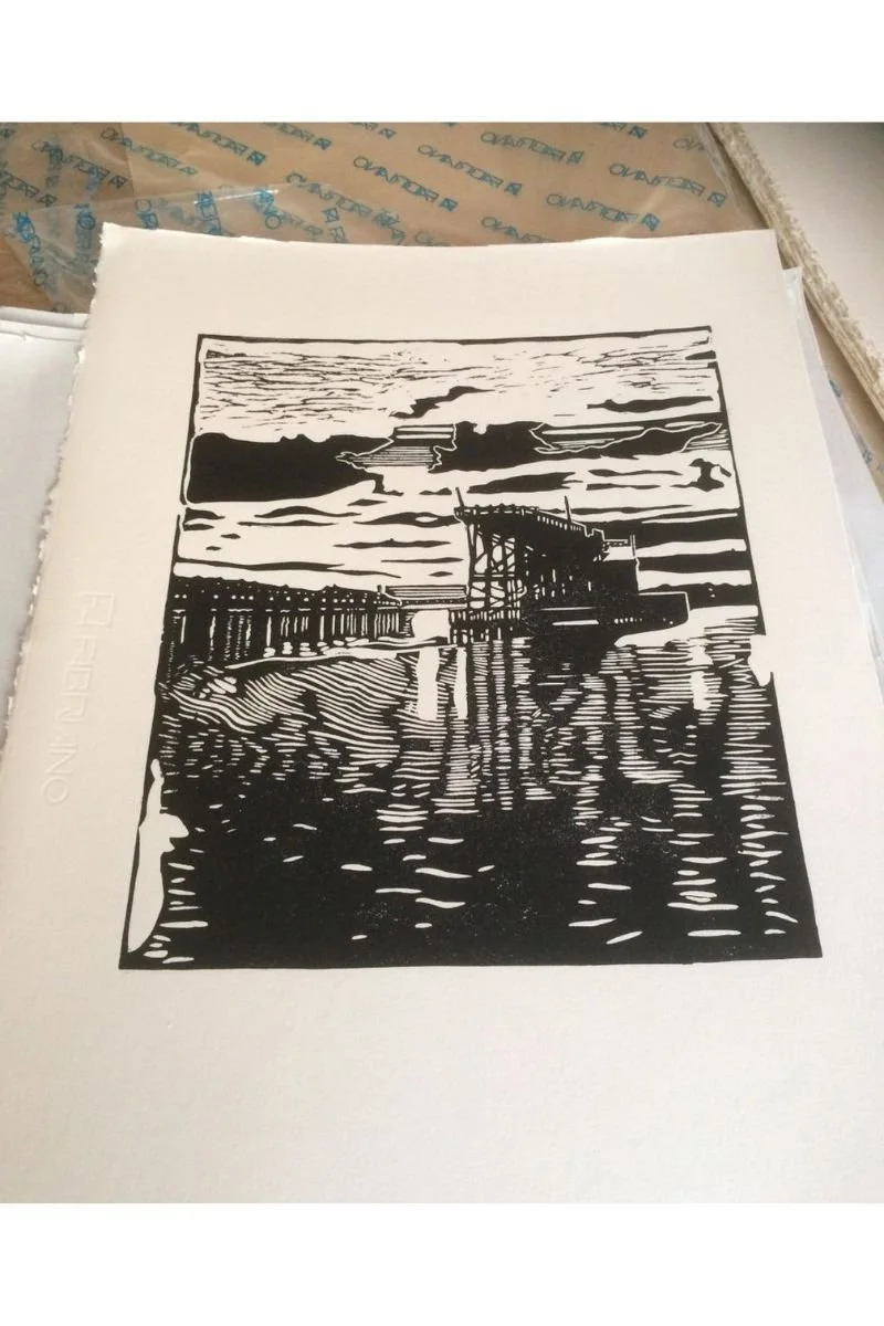 So, what does linocut mean? Linocut is a form of relief printing, where the image is carved into a soft linoleum block. The uncarved areas remain raised and are inked, while the carved areas stay ink-free and white on the final print.